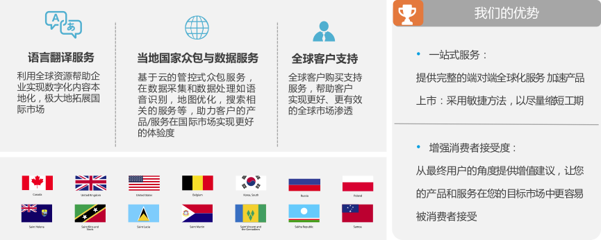 文思海辉本地化服务为客户提供集内容本地化、软件本地化、全球化策略和本地化测试在内的一整套端到端全球化服务解决方案。不仅能够实现一站式单语言到多语言发布,还可提供专业培训、专职人员和定制化客户工具,采用灵活的流程和技术来满足客户的灵活和弹性项目需求。在敏捷交付、项目全球化、精确定位本地市场用语等方面,文思海辉都拥有极大优势,助力客户快速本地化以获得更多国际用户,拓展全球市场。