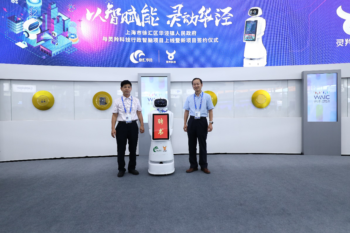 9月18日,2018世界人工智能大会举办之际,灵羚科技与上海徐汇区华泾镇人民政府合作的行政智脑项目上线仪式暨新项目签约仪式同期举行。当天,上海市徐汇区商务委主任华欣致辞,华泾社区事务受理服务中心常务副主任朱雄亲自为小华佩戴上岗证,宣布文思海辉行政智脑机器人正式上岗,开始服务。