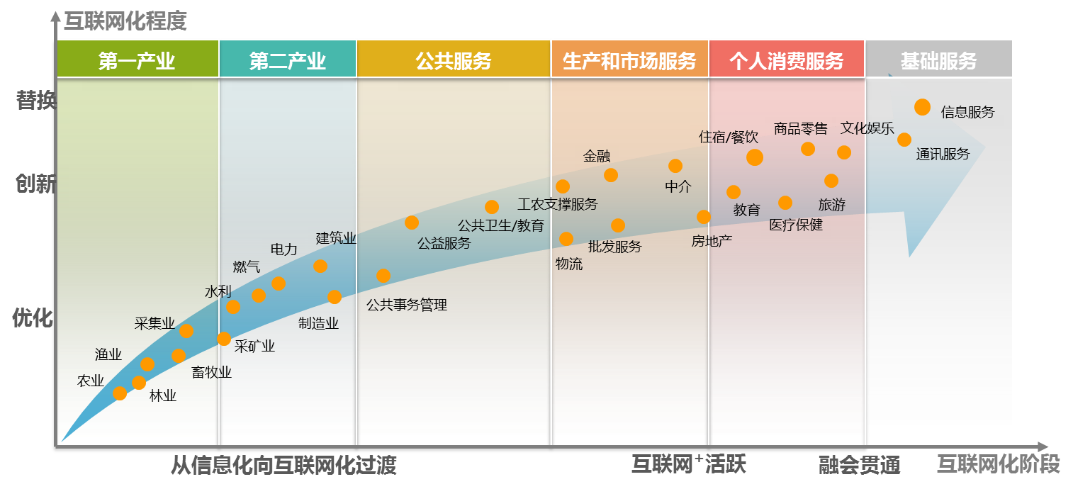 从易观智库给出的各行业“互联网+”进程来看,属于第一产业的“农、林、牧、渔”几大行业同处于信息化进行中,尚待向互联网化过渡的阶段,尤其是农业又排在了各第一产业中的末端。