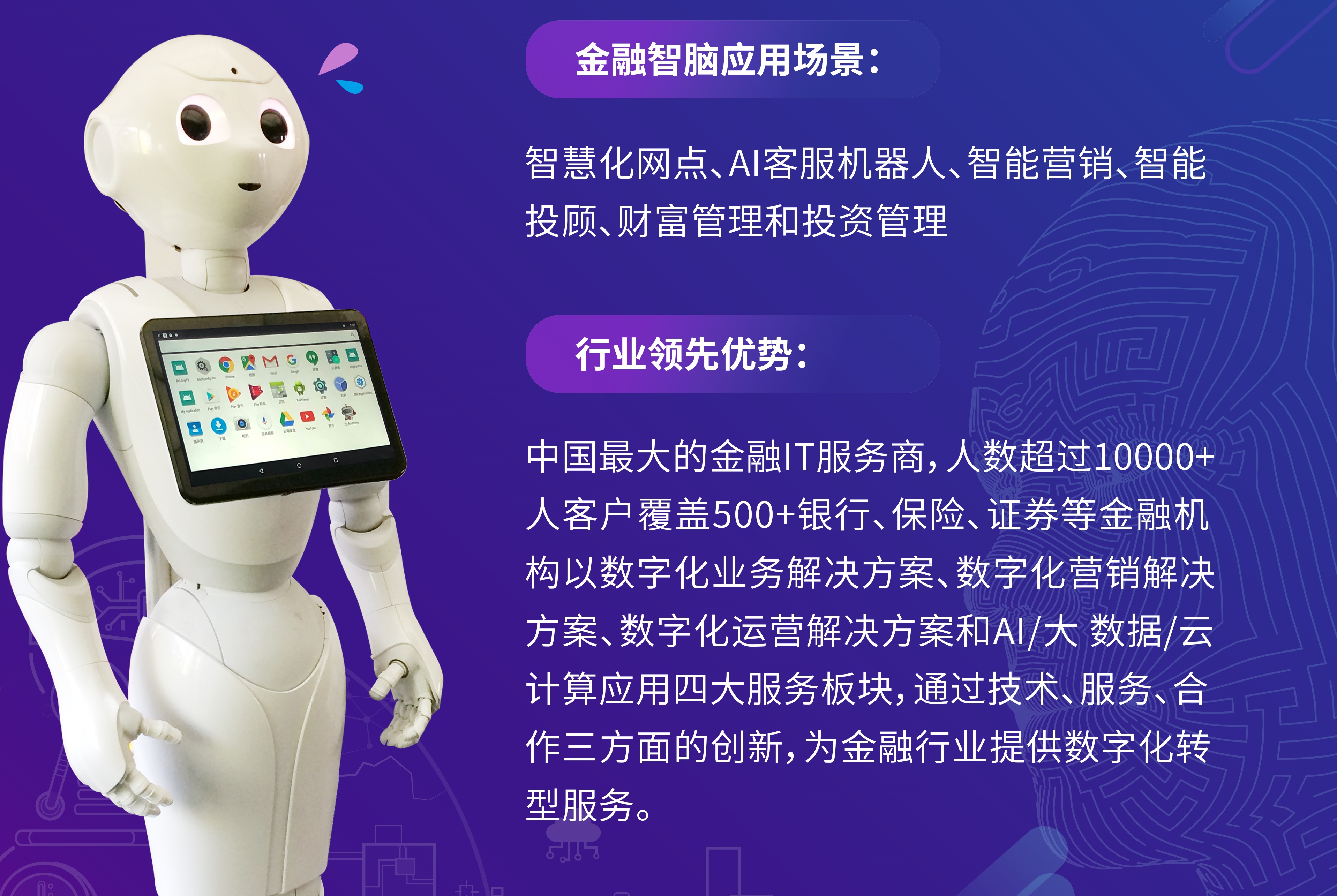 金融是本次大会的重头戏,新时代对金融发展提出了新要求,金融服务企业需要以科技创新全力支持实体经济发展。文思海辉基于在金融行业的深厚积累,成功落地实践AI金融智脑平台,可根据客户需求提供定制化AI+解决方案,满足客户敏捷交付和弹性需求。其主要应用在智慧化网点、AI客服机器人、智能营销、智能投顾、财富管理和投资管理等领域,以数字化业务解决方案、数字化营销解决方案、数字化运营解决方案和AI/大数据/云计算应用四大服务板块为基础,通过技术、服务、合作三方面的创新,为金融行业提供数字化转型服务。