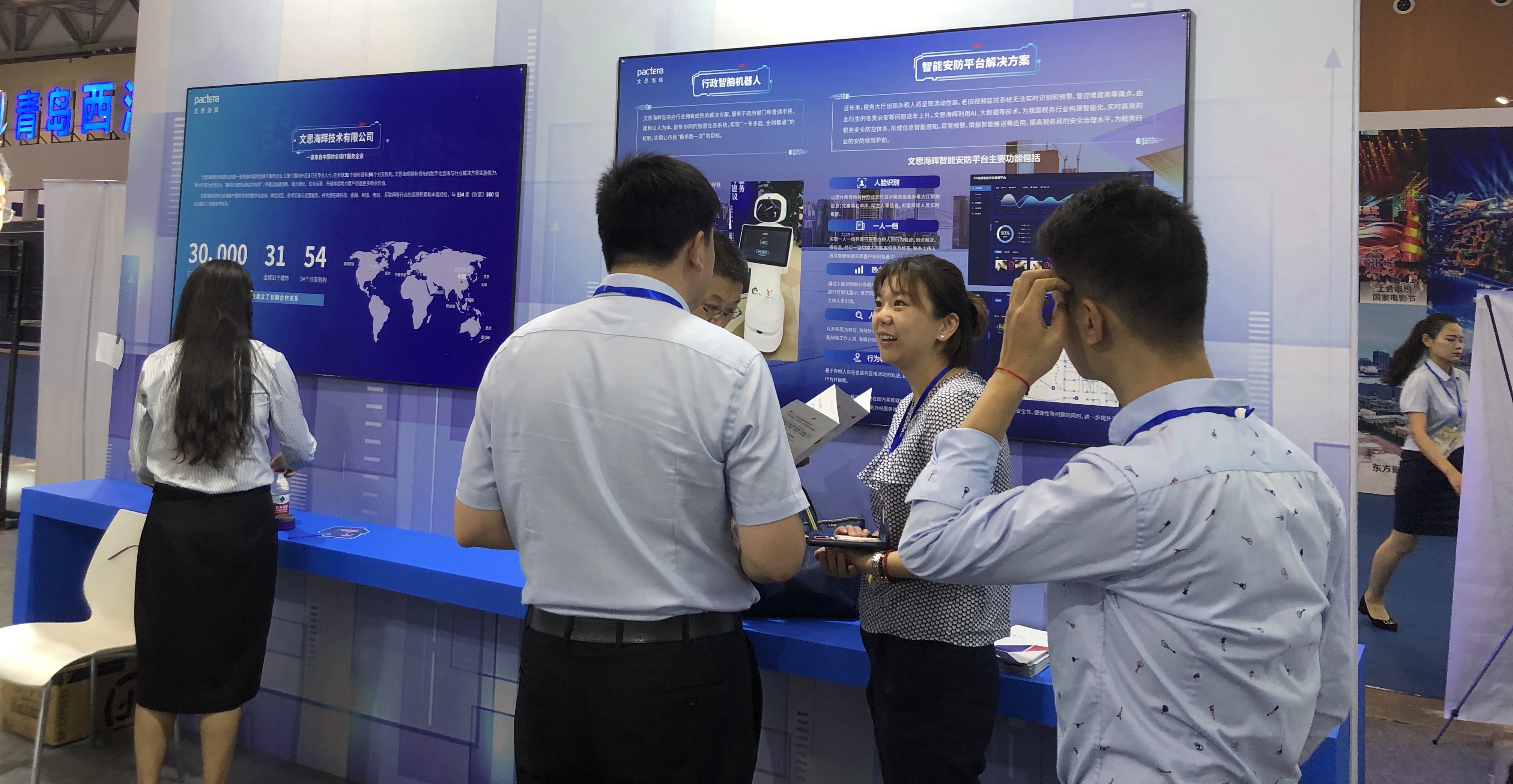 本次博览会以“ICT(信息通信技术)助力产业发展”为主题,以培育提升软件产业“五名”(名品、名企、名园、名展、名人)为重点,聚焦“高端制造业+人工智能”领域软件赋能和创新发展,设置软件与信息通信技术成果展、平行论坛、工业互联网APP创新应用大赛和系列发布对接活动四大板块内容。文思海辉作为中国IT服务领军企业,在青岛国际会展中心2号馆国内知名企业展区ET41展位,带来了“行政智脑”与“智能安防平台”两大AI+政务解决方案,吸引众多与会嘉宾的关注,成为会场焦点之一。