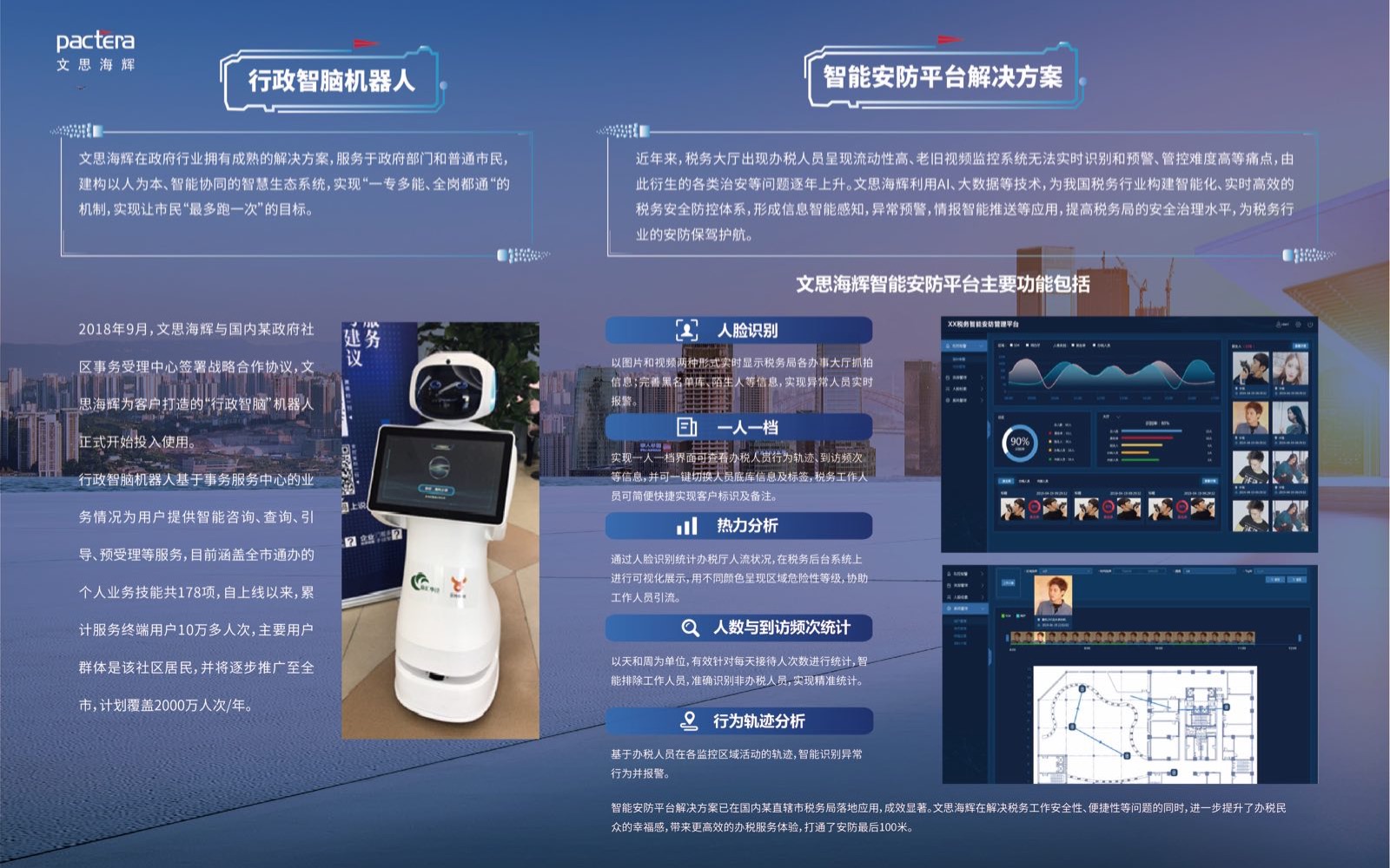 现场,文思海辉还带来“智能安防平台”解决方案展示。文思海辉“智能安防平台”集成了软件、硬件与AI技术,能为税务服务的信息识别与安全预警提供有力支持。通过税务大厅的摄像头,记录每天所有往来人员,利用AI技术建设标准人脸库以及相应身份数据,基于数据库进行智能化应用和分析,对可疑或敏感人员进行预警提醒,使大厅安防工作可操可控,图像化直观呈现。文思海辉在解决税务工作安全性、便捷性等问题的同时,进一步提升了办税民众的幸福感,带来更高效的办税服务体验,打通了安防最后100米。据悉,该解决方案不久将实现应用。