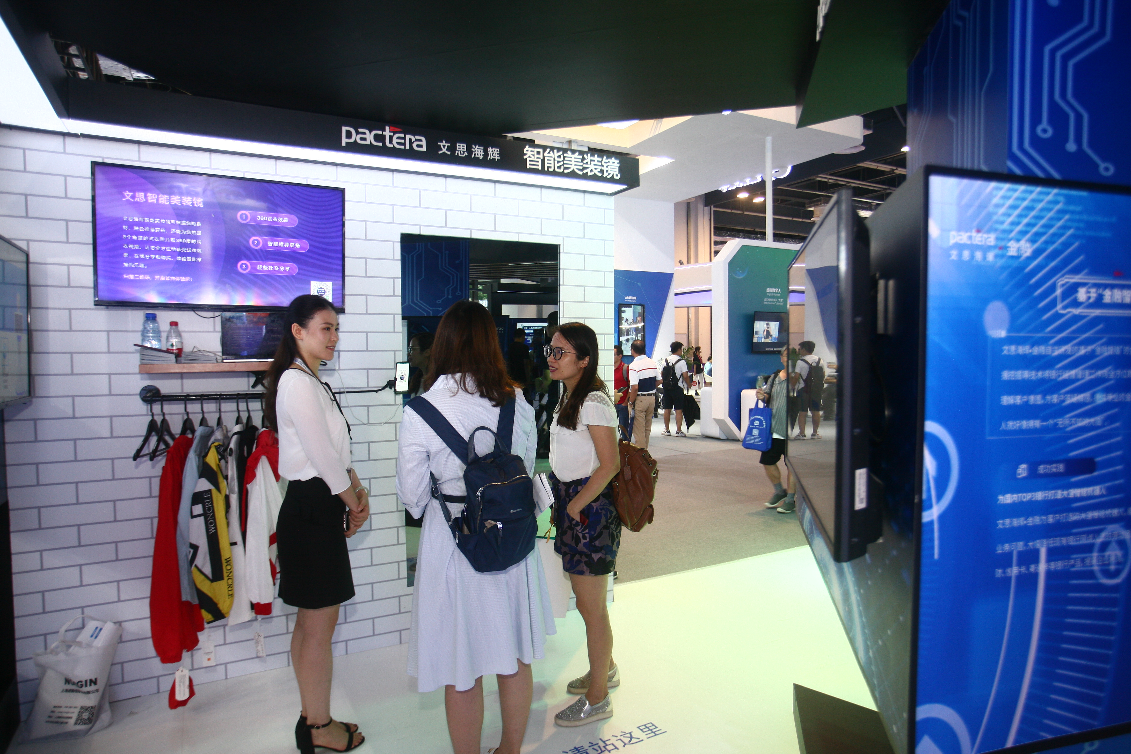 在会场另一边,文思海辉智能美装镜也吸引了众多参展者的关注。它能根据用户的身材、肤色进行穿搭推荐,还能在用户试衣的过程中,为用户拍摄8个角度的照片和一段小视频,让其全方位地感受服装的上身效果。用户可通过社交平台分享视频,以口碑传播的方式帮助品牌扩大知名度和提升服装销量。